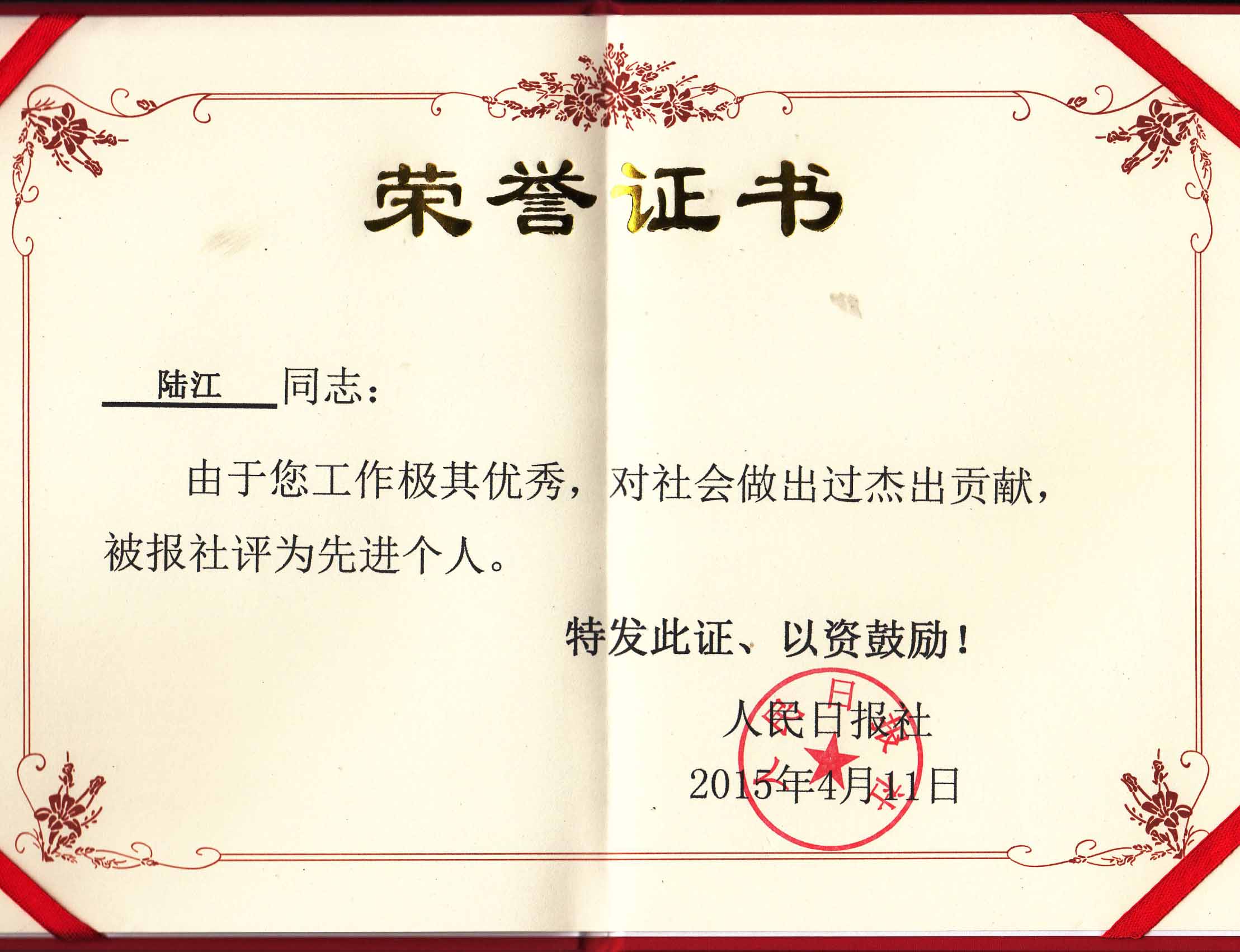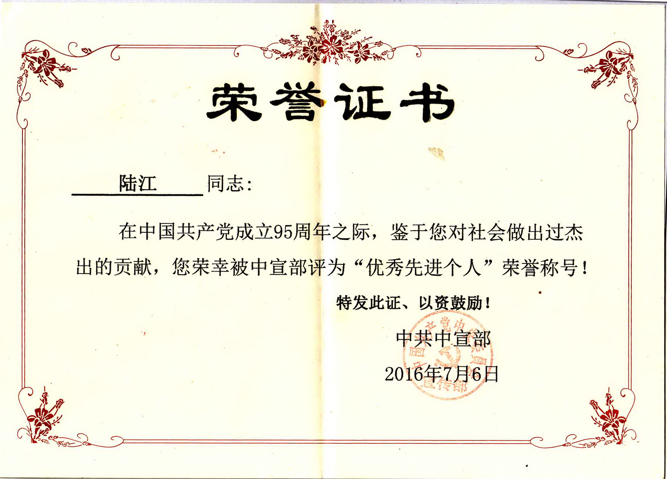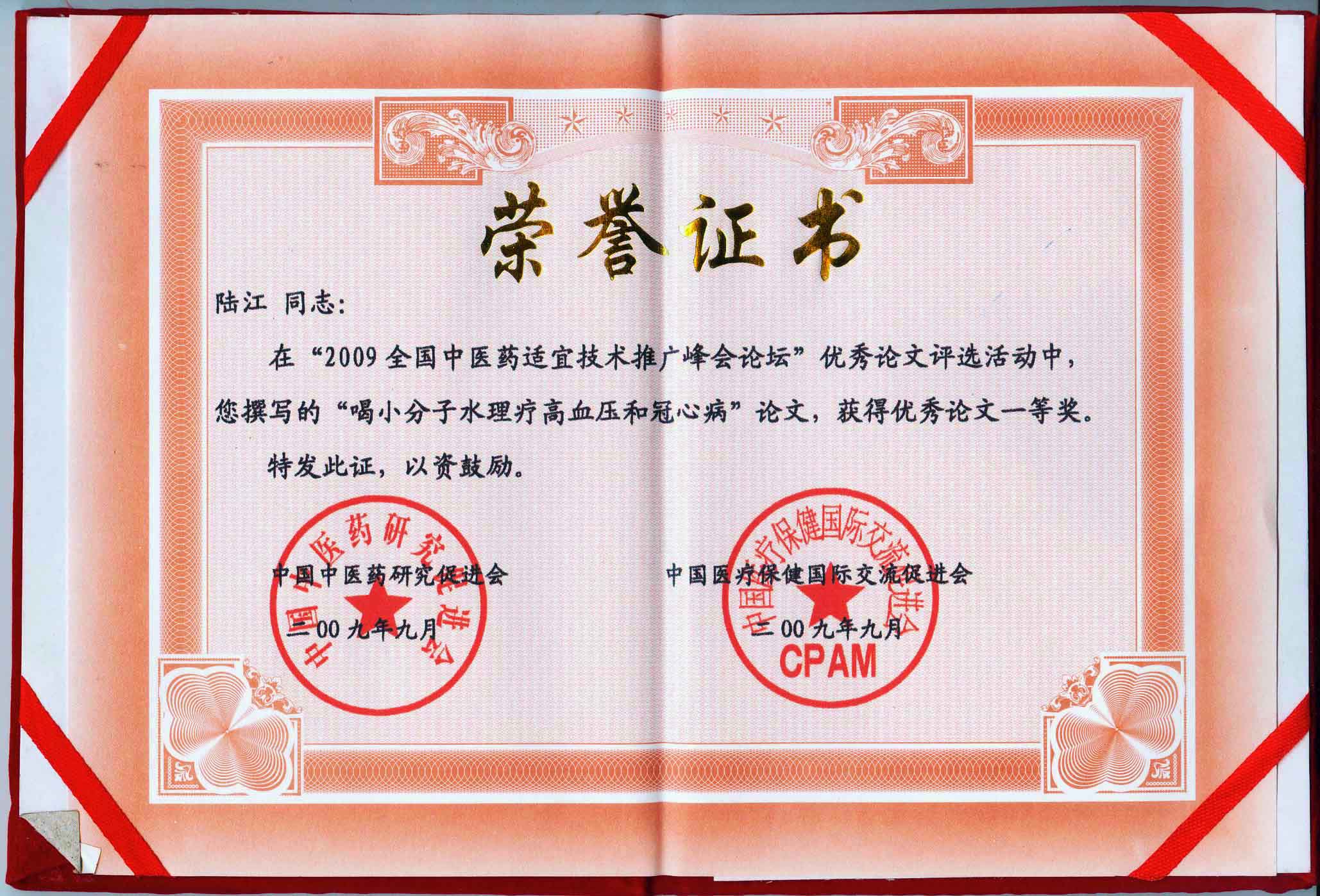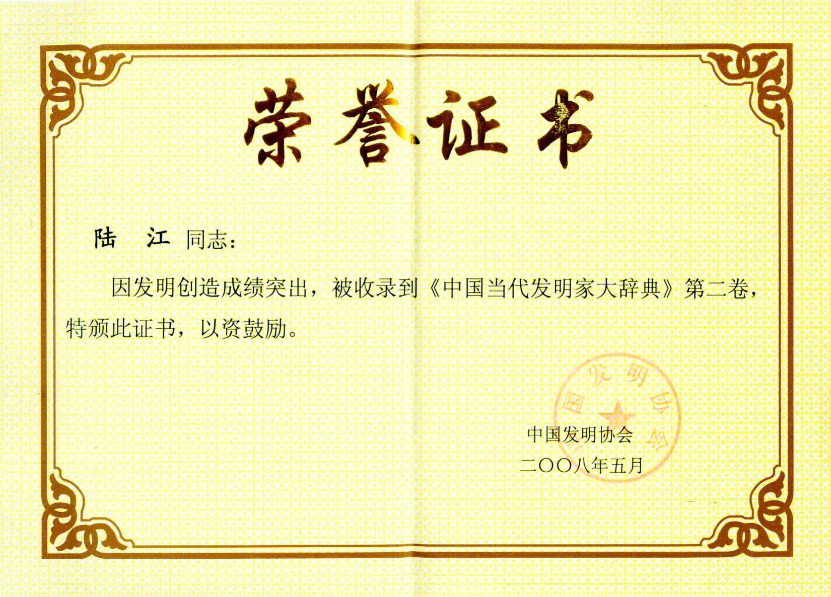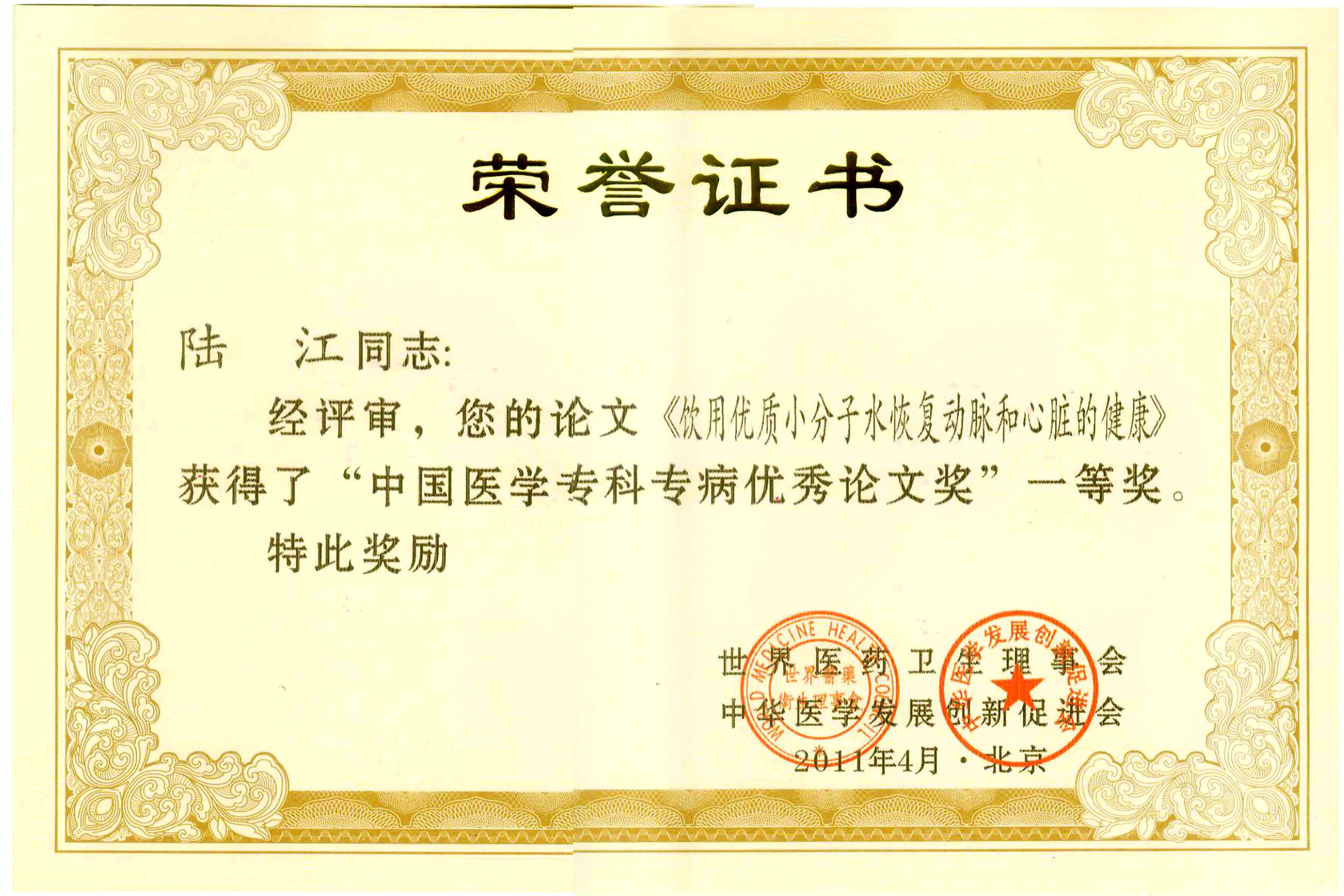 陸江的論文獲一等獎榮譽(yù)證書-- 陸江論文獲創(chuàng)新論文獎牌