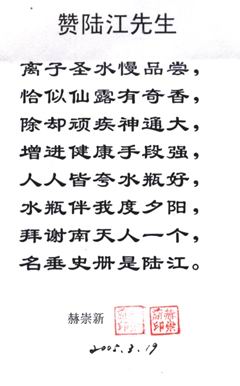 凡尊重中國古代養(yǎng)生智慧的患者,堅(jiān)持“已饑方食”和定時主動補(bǔ)水者,均可祛病康復(fù)。如牡丹江醫(yī)學(xué)院87歲的張鵬圖飲用半年后高血壓未痊愈,陸江與他通話交流,了解他原先每日主食4兩,建議他用“已饑方食”減少主食肉食量,他理解后,將每日主食減為3兩,少吃兩塊肉,飲用一年治愈26年的冠心病和高血壓。他2003年5月31日來信說:“飲用卓康小分子團(tuán)水是根治高血壓、冠心病、糖尿病的一把金鑰匙,是填補(bǔ)醫(yī)學(xué)空白,為人類造福,應(yīng)推廣該產(chǎn)品。”