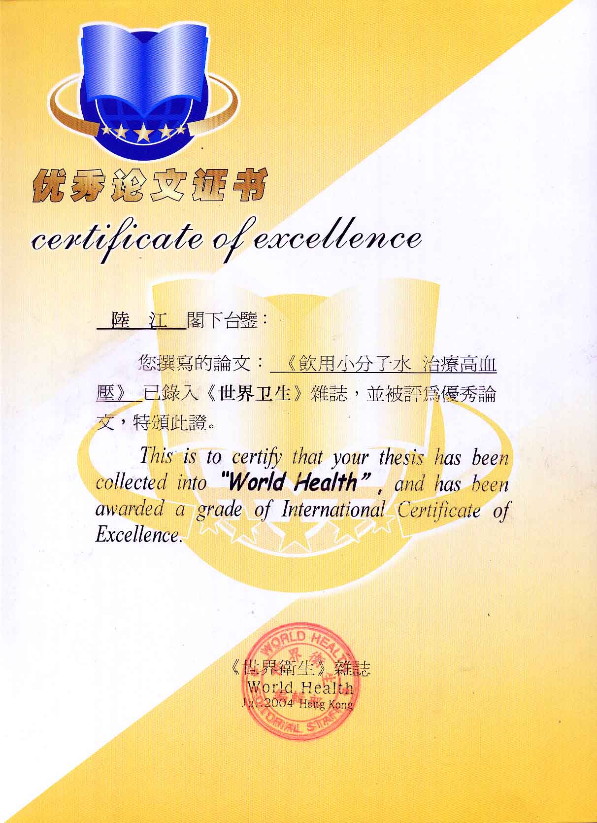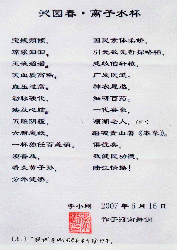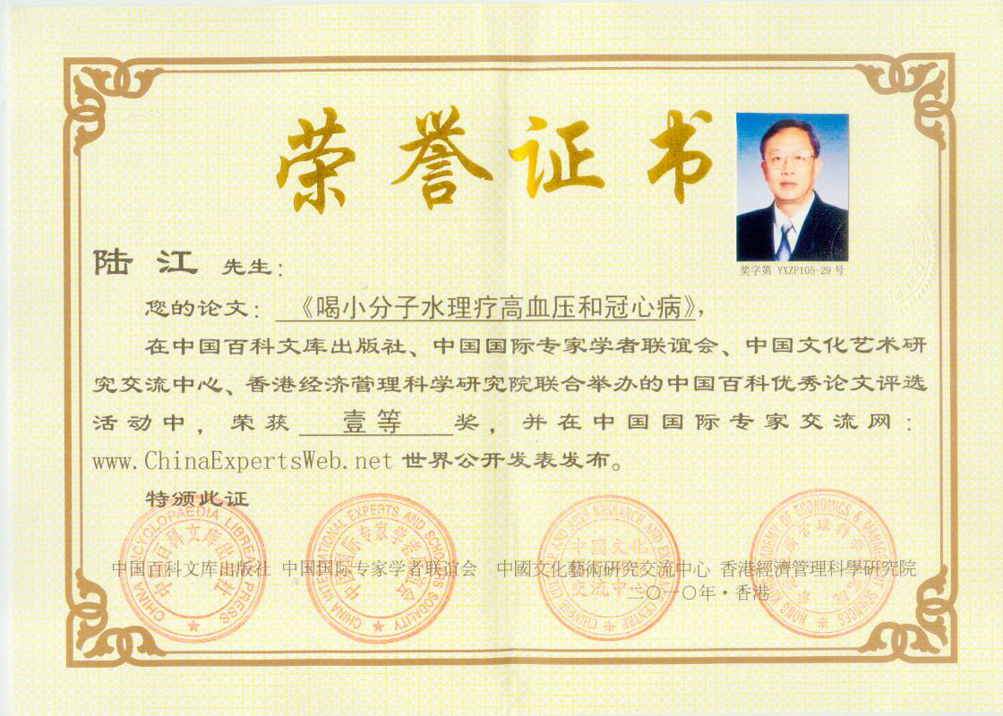 -----我是從事建筑的高工,本來沒有資格去攻克醫(yī)學(xué)難題,卻為了自身健康才扣響醫(yī)學(xué)的大門。由于我1990年患高血壓,因怕中風(fēng)才研究發(fā)明了離子水瓶,我把水處理成微小分子團(tuán)水,飲用后治愈了高血壓。便于1993年底送到三家省級醫(yī)院做臨床試用4個月。經(jīng)北京和廣西醫(yī)學(xué)專家鑒定:"降脂降壓效果好"," 能擴(kuò)大心腦動脈流量,改善心腦電圖以及微循環(huán)","對治療心腦動脈粥樣硬化、高血壓、高血脂有良好的醫(yī)療保健作用。""產(chǎn)品的技術(shù)性能和療效達(dá)到了同類產(chǎn)品的國內(nèi)領(lǐng)先水平,經(jīng)廣西醫(yī)學(xué)科學(xué)情報(bào)研究所檢索,未見國外有類似報(bào)道。"中國醫(yī)學(xué)科學(xué)院張正國教授從美國國立醫(yī)學(xué)圖書館數(shù)據(jù)庫存Medline檢索英俄文資料,均未見類似報(bào)告。2000年上市后,我為了對消費(fèi)者負(fù)責(zé)而繼續(xù)觀察研究,一直通過《信譽(yù)卡》和《質(zhì)量跟蹤調(diào)查書》向患者承諾療效,請用戶使用6個月后反饋效果。和脂壓患者飲用2至5個月內(nèi),消除癥狀,停服藥物,血壓正常;冠心病患者飲用3~5個月逐漸減輕至消除心絞痛、房顫等癥狀,不再服藥,飲用1年左右心電圖正常,經(jīng)冠脈造影掃描無明顯狹窄,表明冠心病痊愈。大量患者還反映許多衰弱器官被修復(fù),讓前列腺增生、慢性咽喉炎、慢性氣管炎、支氣管炎、慢性胃炎、腸炎和膽囊炎等不藥而愈;2型糖尿病患者是因?yàn)橐葝u衰弱致病,飲用該水半年至一年,逐漸減藥至停藥,血糖尿糖正常,真正治愈2型糖尿病。中風(fēng)后遺癥患者飲用六七個月,可逐漸減輕至消除肢體和語言障礙,表明飲用該水能讓壽命很長的神經(jīng)元細(xì)胞逐漸修復(fù),奇跡般地恢復(fù)肢體和語言功能。飲用后還使胸腺和脾臟兩個重要的免疫器官被修復(fù)和增強(qiáng),產(chǎn)生免疫細(xì)胞多,提高了免疫力,使人不生病或少生病。自此, 飲用微小分子團(tuán)水創(chuàng)造了攻克冠心病、高(低)血壓和糖尿病三大醫(yī)學(xué)難題的奇跡。人們對此感到不可思議,但實(shí)踐是檢驗(yàn)真理的唯一標(biāo)準(zhǔn)。