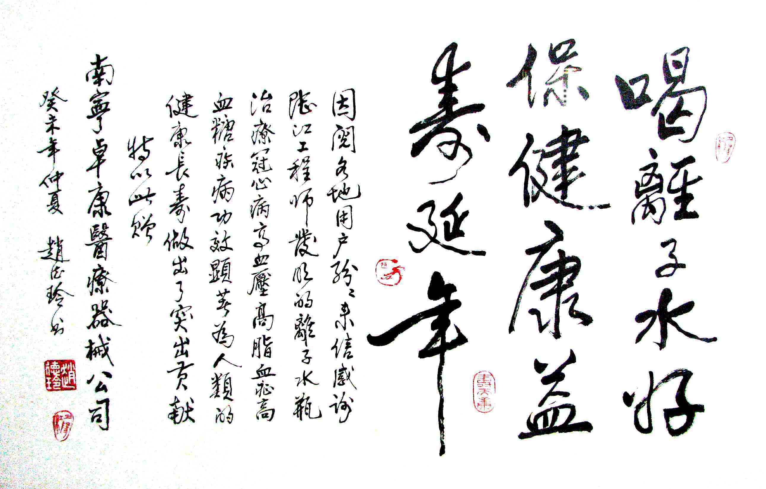 - -- 幾千年來,人類靠醫(yī)藥不能根治冠心病、高血壓和糖尿病,如想根治,那是夢想。可是,我從中國基礎(chǔ)醫(yī)學(xué)研究成果受到啟發(fā),研發(fā)了一種發(fā)明產(chǎn)品,處理出微小分子團(tuán)水讓人飲用,實(shí)現(xiàn)了人類這一夢想!患者飲用后遠(yuǎn)離了冠心病、高血壓和2型糖尿病。這一成果曾經(jīng)過臨床試用和專家鑒定,作為準(zhǔn)字號醫(yī)療器械讓廣大患者飲用,療效進(jìn)行跟蹤調(diào)查。很多患者的反饋情況令人感動,我放在公司網(wǎng)站上(nnzk.com),震撼了醫(yī)學(xué)專家,也使廣大同胞受到啟發(fā)。人們盼望飲用它給細(xì)胞補(bǔ)水,治愈多種病癥,既省錢,又安全,而且延長壽命。