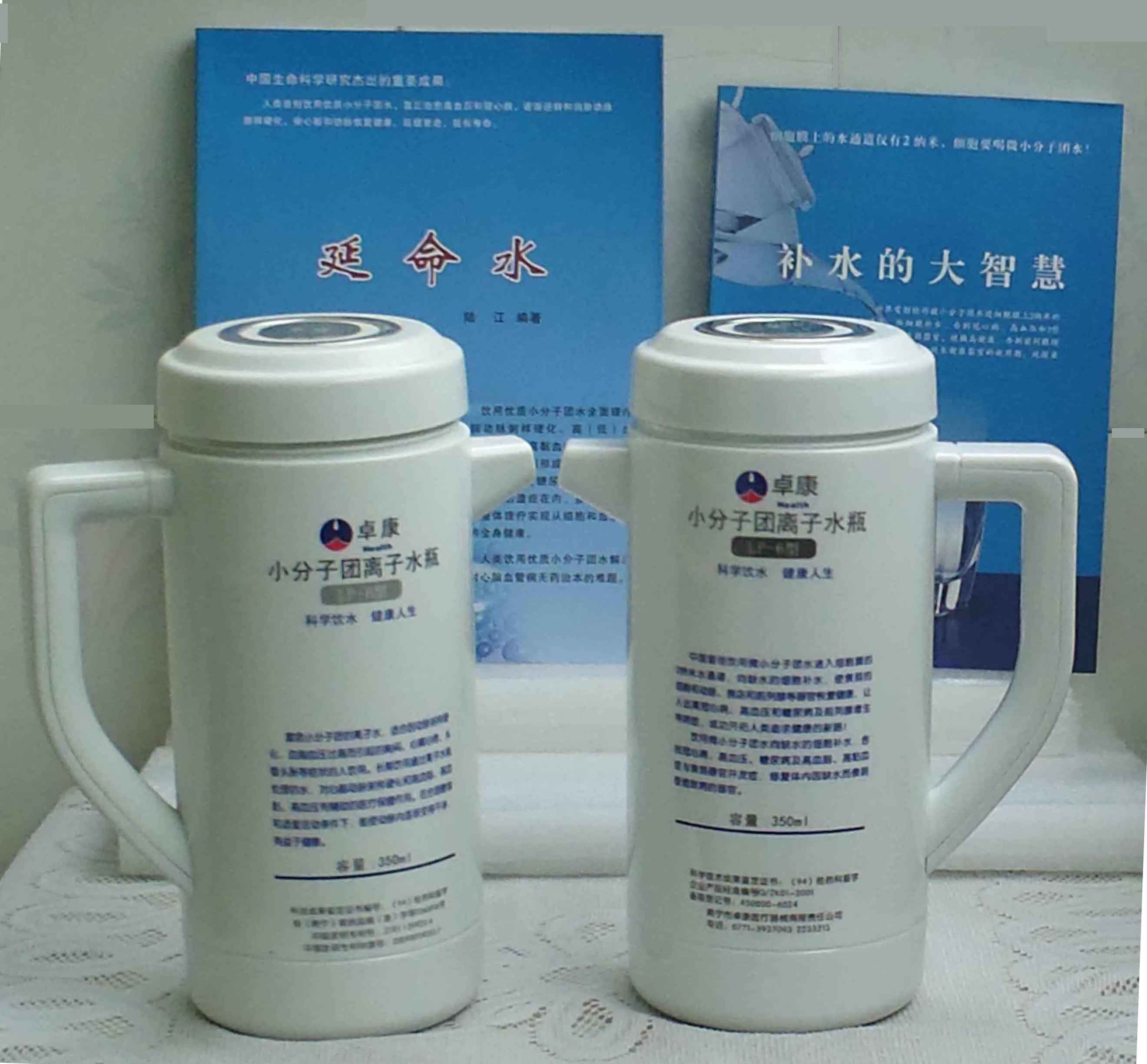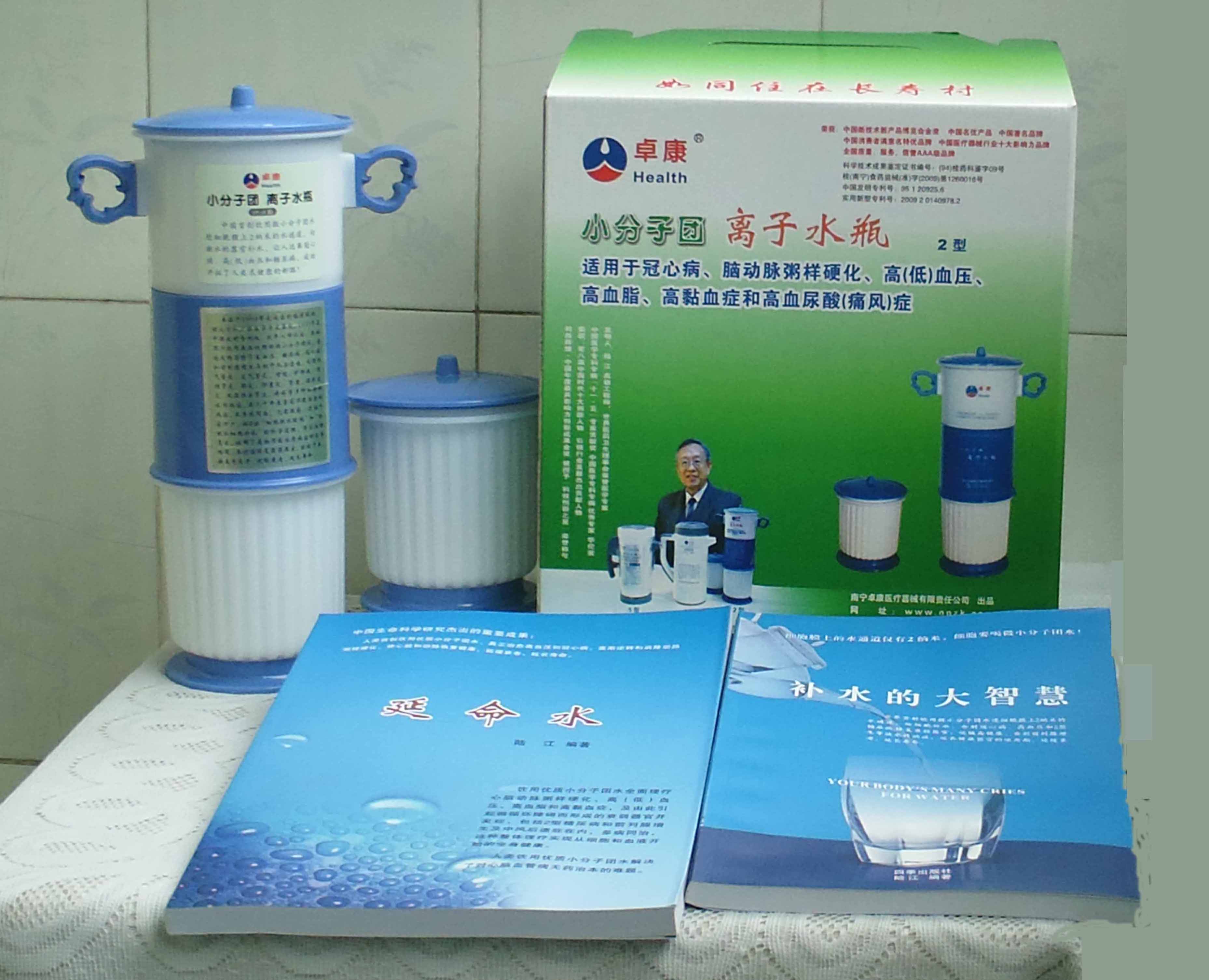 本品大量用戶的使用效果表明,能治愈冠心病、腦動脈硬化、原發(fā)性高(低)血壓、高血脂、高粘血癥、高血尿酸癥(痛風(fēng))和2型糖尿病、衰弱器官并發(fā)癥(前列腺增生、腎衰與尿毒癥)及中風(fēng)后遺癥等療效好。產(chǎn)品配信譽(yù)卡。使用壽命30年,不換芯,易清洗。團(tuán)購優(yōu)惠。從郵局匯款,匯費(fèi)1%,地址按本頁下方地址、聯(lián)系人寫。從銀行匯款,請點(diǎn)擊[聯(lián)系匯款]欄,從工商銀行匯款,建設(shè)銀行、農(nóng)業(yè)銀行匯款,均免收匯費(fèi),匯款后20--30分鐘內(nèi)發(fā)短信,可用微信轉(zhuǎn)帳,均免匯費(fèi),微信號即手機(jī)號13768308380。匯款后,告知你的姓名和地址,我公司聯(lián)系人手機(jī)號是:13768308380。卓康牌離子水瓶為我公司獨(dú)家生產(chǎn),郵購產(chǎn)品配《補(bǔ)水的大智慧》彩印書一本,另配四季出版社出版的新書《補(bǔ)水的大智慧》一本,并配光盤一張(含央視主持人釆訪陸江的對話視頻)。目前市場和"淘寶網(wǎng)"上有人兜售假冒的偽品,望讀者審察辯別真?zhèn)危旒僬哓飧`假冒本公司的各種認(rèn)證、獲獎獎項(xiàng)、專利號和外包裝盒上的中英文字,包括科技成果的鑒定意見等,請讀者注意防偽。如何識別假貨?已經(jīng)買了假貨怎么辦?(請點(diǎn)擊[打假掠影][打假掠影])。
