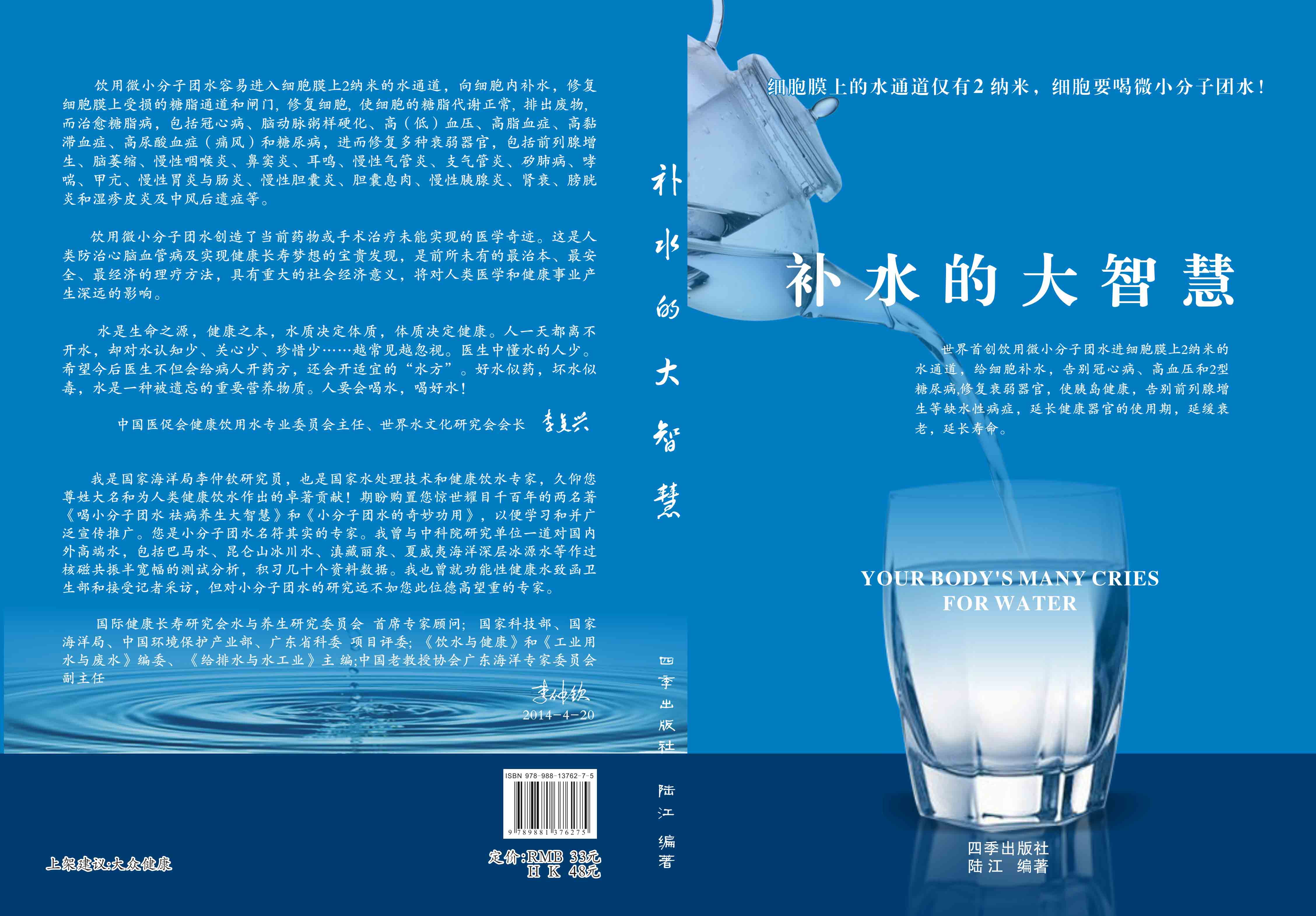 ----幾千年來,人們感到口渴才喝水,誤認(rèn)為口渴是唯一的缺水信號,使喝水量偏少。很多人只知道補(bǔ)血補(bǔ)氣補(bǔ)腎補(bǔ)鈣補(bǔ)硒,而不知補(bǔ)水,逐漸使許多器官缺水,包括皮膚、動脈、氣管、膽囊、腸胃、骨關(guān)節(jié)、腎臟、前列腺和胰島缺水,以致患冠心病、高(低)血壓和糖尿病等缺水性病癥。美國F·巴特曼醫(yī)學(xué)博士寫有《水是最好的藥》一書很受歡迎,我國2007年譯成中文版,論述人體缺水引起許多病癥,他指導(dǎo)3000多患者喝水治愈了哮喘、胃炎和高血壓等病癥。而我是從2000年起,讓患者飲用微小分子團(tuán)水,因?yàn)槿菀走M(jìn)細(xì)胞膜上2納米的水通道,治愈了許多缺水性的病。我跟蹤調(diào)查14年,發(fā)現(xiàn)凡是認(rèn)真飲用和合理膳食,可治愈冠心病、高(低)血壓和2型糖尿病與衰弱器官并發(fā)癥及中風(fēng)后遺癥。高血壓患者飲用2~5個月,癥狀消除,不再服藥,逐漸逆轉(zhuǎn)至消除動脈粥樣硬化,血壓正常穩(wěn)定,治愈了高血壓;冠心病人飲用3~5個月,消除心絞痛、房顫等癥狀,不再服藥,一年左右心電圖正常,經(jīng)冠狀動脈造影掃描表明冠脈內(nèi)無粥樣斑塊,真正治愈了冠心病;2型糖尿病人飲用3~10個月停藥,血糖尿糖正常,糖尿病痊愈。并且使前列腺增生、慢性咽喉炎、鼻竇炎、耳鳴、慢性氣管炎、支氣管炎、哮喘、矽肺病、慢性胃腸炎、膽囊炎、胰腺炎、腎衰、膀胱炎、風(fēng)濕性關(guān)節(jié)炎、便秘、痔瘡和濕疹皮炎等不藥而愈,而無需終生服藥。飲用微小分子團(tuán)水治愈的是長期吃藥治不好的病,彌補(bǔ)了幾千年來醫(yī)藥的欠缺,成為人類健康的寶貴資源。
